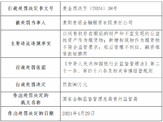 因租后管理不到位、融资租赁款被挪用等 贵阳贵银金融租赁被罚90万元