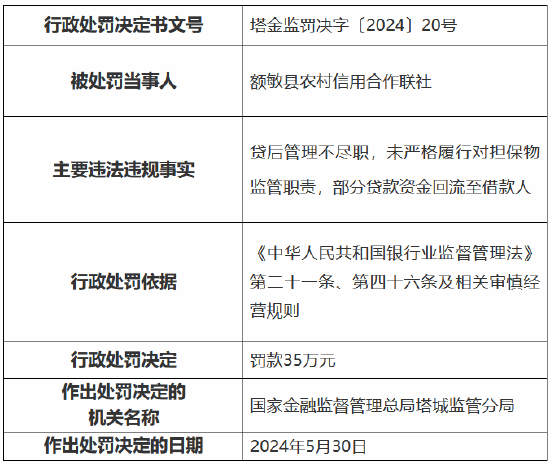 6月3日金融一线消息,国家金融监督管理总局塔城监管分局行政处罚信息公开表显示,额敏县农村信用合作联社因贷后管理不尽职,未严格履行对担保物监管职责,部分贷款资金回流至借款人,被罚款35万元。
