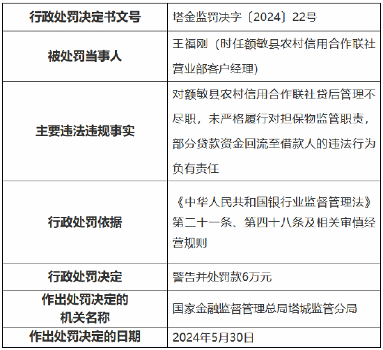 时任额敏县农村信用合作联社营业部主任宋建明、时任额敏县农村信用合作联社营业部客户经理王福刚,二人对上述违法违规行为负有责任,分别受到警告并被罚款6万元。