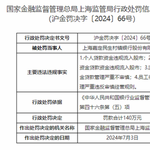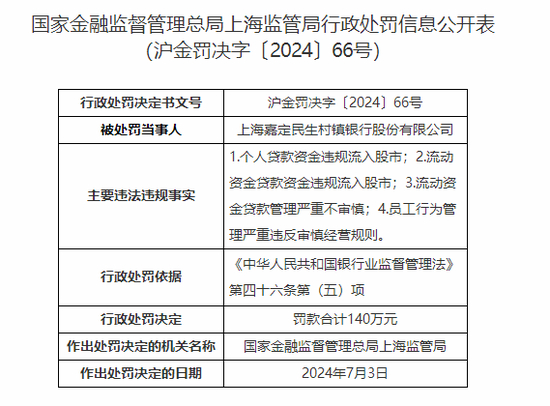 《金融时报》记者注意到,上海嘉定民生村镇银行因为个人贷款资金违规流入股市、流动资金贷款资金违规流入股市、流动资金贷款管理严重不审慎、员工行为管理严重违反审慎经营规则等被监管点名,被罚款140万元。