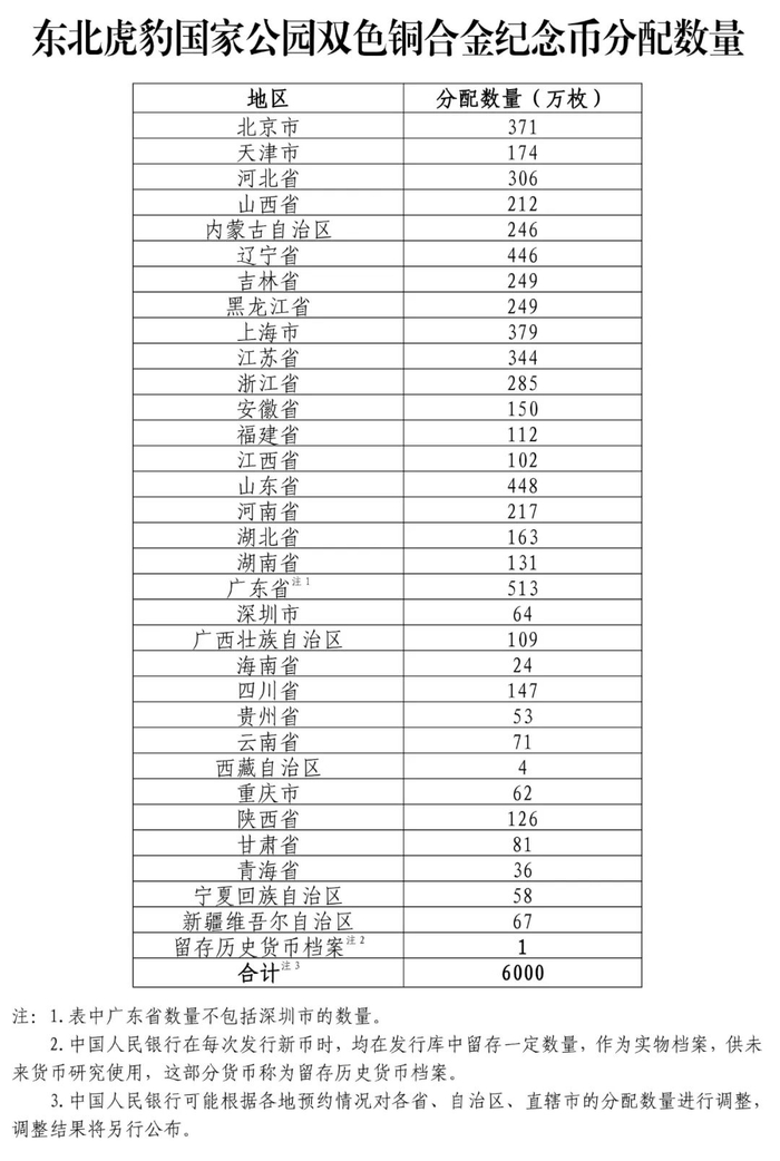 东北虎豹国家公园双色铜合金纪念币面额为10元,直径27毫米,材质为双色铜合金,发行数量为6000万枚。各省、自治区、直辖市分配数量如下: