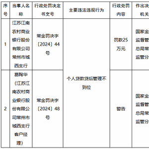 江苏江南农村商业银行常州市城西支行因个人贷款贷后管理不到位被罚25万元