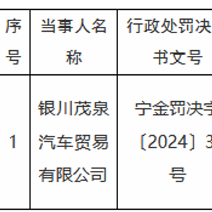 银川茂泉汽车贸易公司因管理不善导致许可证遗失被罚0.5万元 金融一线 2024.12.2721:11 关注 12月27日金融一线消息,国家金融监督管理总局宁夏监管局行政处罚信息公开表显示,银川茂泉汽车贸易有限公司因管理不善导致许可证遗失,受到警告并被罚款0.5万元。