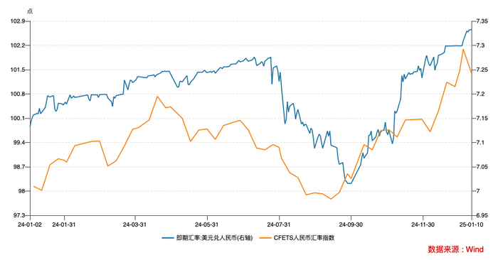 Wind数据显示,2024年人民币在岸汇率由年初的7.13贬值至年末的7.3,但CFETS人民币汇率指数由年初的97.42升至年末的101.47,出现一定幅度的升值。