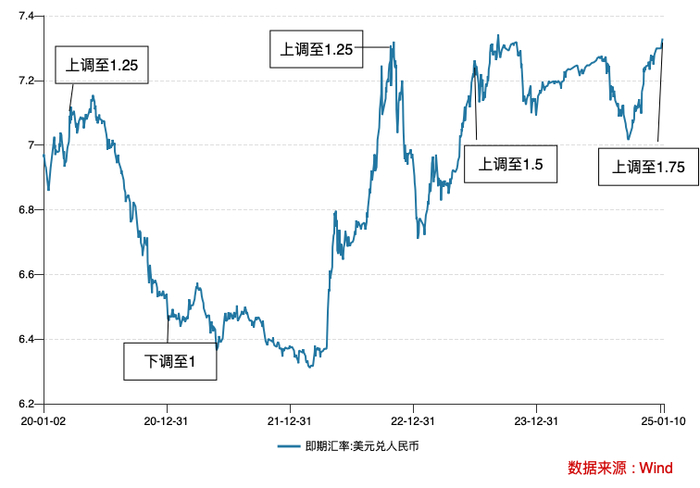 中国是大型经济体,货币政策以我为主,如果国内经济下行压力加大,降准降息也会落地,相应会承受一定的人民币贬值压力。比如2022年7月、8月,主要经济指标增速大幅回落,8月政策利率下调10BP,人民币贬值突破7。