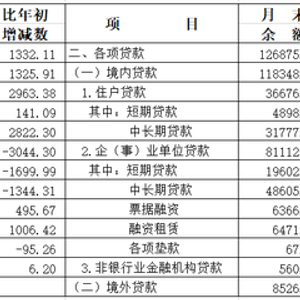 4月份,人民币贷款增加5亿元,同比少增264亿元。分部门看,住户部门贷款增加154亿元,其中,短期贷款减少28亿元,中长期贷款增加183亿元;企(事)业单位贷款减少239亿元,其中,短期贷款减少358亿元,中长期贷款减少36亿元;非银行业金融机构贷款增加25亿元。外币贷款增加8亿美元,同比多增30亿美元。