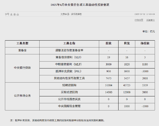 7月2日金融一线消息, 央行公布6月各项工具流动性投放情况。
