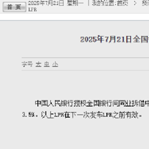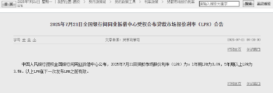7月21日金融一线消息,中国人民银行授权全国银行间同业拆借中心公布,贷款市场报价利率(LPR)为:1年期LPR为3.00%,5年期以上LPR为3.50%,均较上月保持不变,以上LPR在下一次发布LPR之前有效。