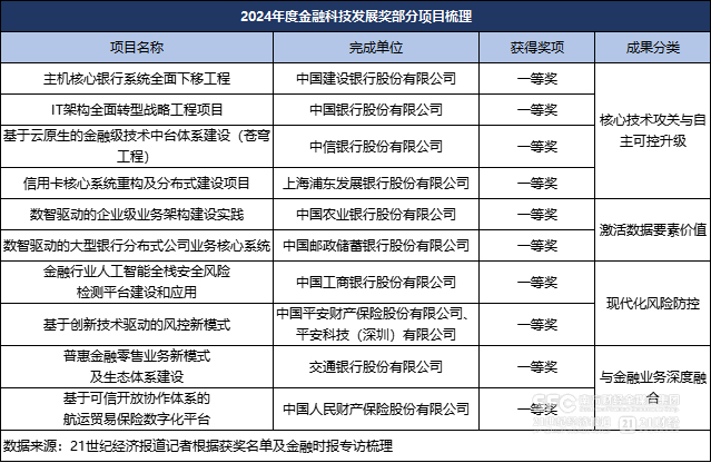 在相关获奖成果案例中,包括建设银行、浦发银行、中国银行、中信银行、交通银行、人保财险、农业银行、邮储银行、工商银行、平安财险等10家金融机构获得2024年度金融科技发展奖一等奖的项目作为代表成果被提及。核心软硬件从“可用”迈向“好用”