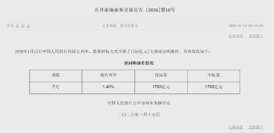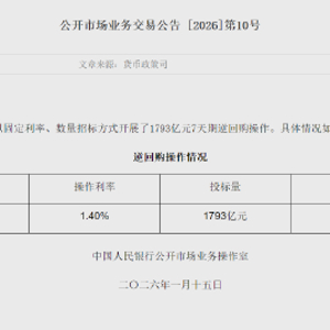 1月15日金融一线消息,2026年1月15日中国人民银行以固定利率、数量招标方式开展了1793亿元7天期逆回购操作。