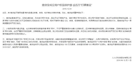 12月1日凌晨,借贷宝官方微博发布声明,借贷宝是合法合规的网络直接借贷平台,平台上从未产生、储存过任何“裸条”照片。