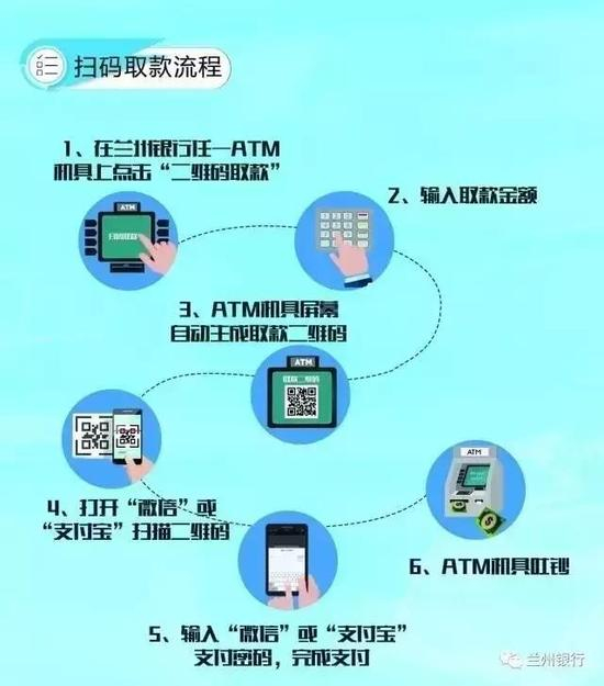 从兰州银行给出的业务示意图可以看出,兰州银行的这个取现业务与其他银行的无卡取现业务不同。根据这个示意图,可以看出步骤是:点击兰州银行ATM机上的“二维码取款”,打开微信或支付宝扫描ATM屏幕上的二维码,在微信支付宝上输入金额密码等即从微信支付宝的余额里可取到现金。跟其他银行不同的是,其他银行的无卡取现业务是“自家银行”、“自家APP”,而兰州银行此举完全可以做到“别家银行”、“微信支付宝扫一扫”。假设你招行卡上有500元余额,那么可以通过微信支付宝先将银行的钱转到微信支付宝余额,再通过兰州银行ATM取出现金。
