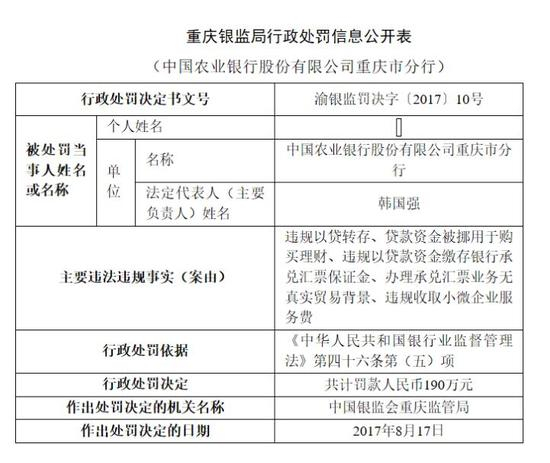 农业银行重庆分行因存在违规以贷转存、贷款资金被挪用于购买理财、违规以贷款资金缴存银行承兑汇票保证金、办理承兑汇票业务无真实贸易背景、违规收取小微企业服务费等违法违规事实,被银监局罚款人民币190万元。