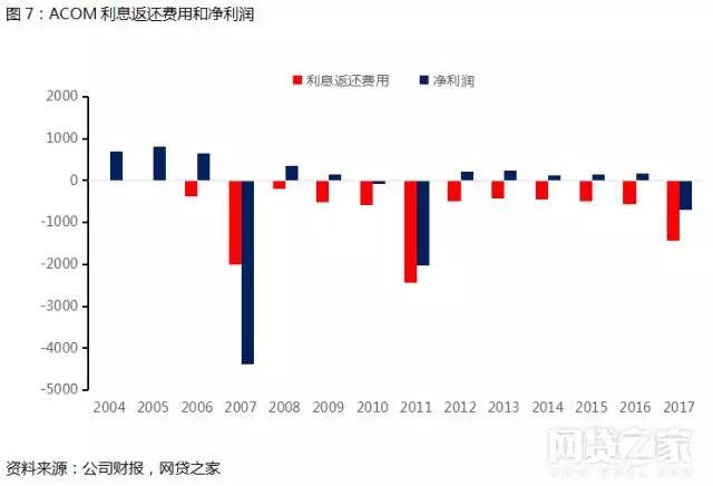 以日本四大之一ACOM为例,ACOM于2006年起向贷款人返还超额利息。我们根据其年报统计,在2006~2017财年,ACOM一共向贷款人返还利息9984亿日元,严重影响其最近10多年来的经营业绩。在2004至2006年,ACOM的净利润在600亿日元以上,但在2006年《贷金业法》修正并实行后,ACOM在十年内累计亏损5770亿日元,这与巨额的利息偿还不无关系。