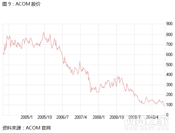 但这种战略调整是以牺牲企业利益为代价的,加上陡增的、持续的利息偿还支出,ACOM业绩惨淡股价遭遇暴跌。数据显示,从2006年初的800日元跌至2010年100日元左右,3年时间市值缩水85%以上。
