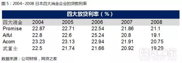 同时,而为了防止贷金从业者过度授信、债务人多头借贷,在借款人的借款余额方面,修正的新法规定借款人贷款余额不得超过年总收入的三分之一,否则新的借款将被禁止。因此,家庭主妇、学生等无收入群体的贷款规模被大幅限制。对此,在《贷金业法》实施期间,日本四大消金企业开始减少对于高风险人群的贷款以控制贷款利率符合监管要求。如下图显示, 2006年起,日本四大消金企业的放贷利率开始出现下降。