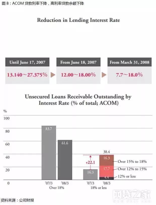 事实上,随着《贷金业法》的修正,ACOM是最早改变经营策略的消费金融企业。ACOM率先摆脱此前对于高风险客户的依赖,开发低利率信贷产品以吸引高质量客户。2007年下半年起,ACOM产品的利率区间从此前的13.14%~27.375%下调到12%~18%以满足《利息限制法》的要求。在利率下降后,其超额利率贷款余额也出现下降。在2007年3月,ACOM利率超过18%的贷款月占比为83.7%,而在一年之后该比重下降到61.6%,可见ACOM为符合法律和监管要求在短期内做出了明显的战略调整。