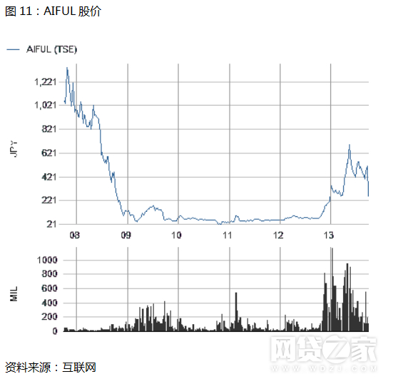 金融危机期间, Aiful公司创始人兼总裁福田吉孝甚至将自己与亲属的500亿日元投入Aiful以补充其消耗严重的资本金,这凸显了当时日本消费金融企业在外部融资上面临的困难。国内贷金业的萧条叠加全球金融危机,Aifui股价从2007年末的1200多日元跌至2009年低点39日元,且在相当长的一段时间内陷入低迷。