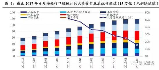回首过去5年,2012年以来大资管行业一直是金融业最璀璨的明珠。资管扩张速度连续多年保持50%以上,根据央行口径统计,2017年大资管行业总规模已突破100万亿(部分重复计算),其中,银行表内、表外理财余额为6.75万亿、21.63万亿,信托资产余额23.1万亿,公募、券商资管、基金专户和子公司、私募规模分别为11.14万亿、17.37万亿、14.4万亿和10.3万亿,创造出了极为宽松的信用环境。