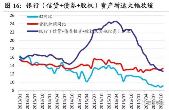 股份行、城商行总资产增速大幅回落8.6和7.5个百分点至6%和16.6%,农商行也明显放缓5.9个百分点,截止3季度,民生、中信、九台农商行等上市银行总资产出现负增长;中小银行理财扩张大幅放缓,城商行、农商行理财增速较16年同期骤降47.4和105.7个百分点,同业理财累计缩水超过2.2万亿;前11月新增委托贷款较16年少增1.06万亿,中小银行新增“股权和其它投资”项同比少增达5.67万亿。