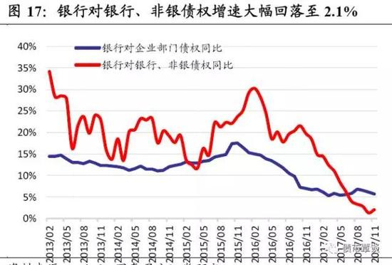 2016年金融脱虚向实,推高宏观杠杆率的最直接反映指标有两个:1)银行总资产扩张远超M2和信贷增速,大量资金在银行、非银内部空转,“银行资产-信贷”增速差最高超过10个百分点,但2017年以来银行资产大幅放缓,过去猛烈扩张的股权和其它投资项剧烈下滑,银行资产增速首次低于信贷;2)银行对银行、非银的债权扩张远超过银行对企业部门的债权增长,两者之差从2016年最高超过15个百分点,到2017年缩窄至-4.8个百分点。
