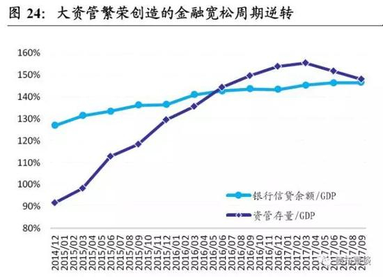 金融周期逆转,进入紧缩的新时代。过去5年,大资管行业一直是金融业最璀璨的明星,资产规模连续几年保持50%以上增速,央行口径下的大资管规模已突破100万亿(部分重复计算),各类机构争相规模竞争、通道为王、结构创新、野蛮生长,创造出极为宽松的信用环境。但随着严监管全方位加强,金融机构开始进入紧缩新时代,广义货币增速下降,信用环境紧缩,通道业务式微,行业开始升级重构,中小银行缩表压力巨大,银银、非银信用链条缩短,这将是债券市场在未来2-3年面临的金融大环境。