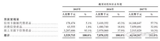 从客户贷款余额来看,2017年末,信用卡余额代偿产品占比为39.9%,依然是第一位,余额为53亿元;放款额位居第三的线上及线下信贷产品,余额占比位居第二,达到31%。
