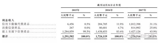 按照产品系列划分,维信金科以绝对金额列示的利息收入表显示,维信金科的利息收入主要来自线上及线下信贷产品,这个产品类别在2017年贡献了14.3亿元,占比43.9%;其次是信用卡余额代偿产品,贡献了10亿元收入,占比为31%;最后是消费信贷产品,贡献了8亿元收入,占比25%。