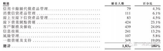 先来看以下维信金科的员工构成。维信金科有雇员1832名。按照职能划分,维信金科雇员人数最多者为客户服务及催收,达439人;其次为线下营业网点运营,达424人。再加上线上至线下信贷产品管理,貌似这家标榜“线上”的公司,也养着庞大的线下团队。