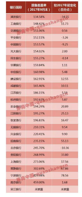数据显示,其实银行业的拨备覆盖率,在去年已有部分松动的迹象。25家银行中,有5家去年9月末拨备覆盖率较年初有所下滑,其中浦发银行下滑幅度最大。截至去年9月末,浦发银行拨备覆盖率较年初下滑34.55个百分点至134.58%,这也是A股上市银行各类财报中出现的最低值。
