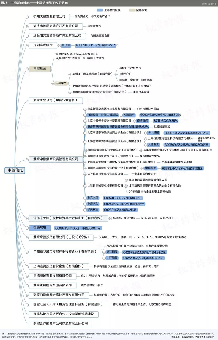据Wind数据不完全统计,截至2018年4月2日,该派系直接持股的上市公司(包括新三板公司)接近60家,总市值接近430亿元。而由中植系除中融信托以外平台直接或间接持股、中融信托资管产品直接或间接持股,以及中融基金旗下产品持股的A股上市公司,接近百家。关于后者的市值统计,目前难以完成。