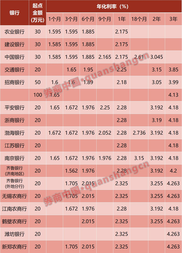 下面是我们根据部分银行官网整理出的部分个人大额存单利率的情况: