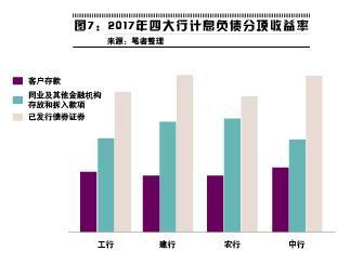 2017年,工行、建行、农行生息资产收益率基本持平,农行高于工行1个基点,工行高于建行1个基点。从生息资产结构配置看,同类资产横向比较,工行偏重同业资产、建行偏重客户贷款及垫款、农行偏重债券投资。从收益率看,工行的同业资产、建行的债券投资、农行的客户贷款及垫款收益率位列四大行该分项资产最高。