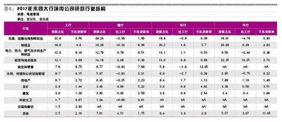 从公司贷款行业结构来看,工行、建行、农行的贷款行业结构无显著差异,配置比例高的前四大行业是交通、运输仓储和邮政业;制造业;电力、热力、燃气及水的生产和供应以及租赁和商务服务,占全部贷款余额约65%。中行贷款集中度高于其他三大行,前述四大行业占全部贷款余额的76.81%,中行在制造业、租赁和商务服务业贷款比例比工行分别高8.29和10.25个百分点。