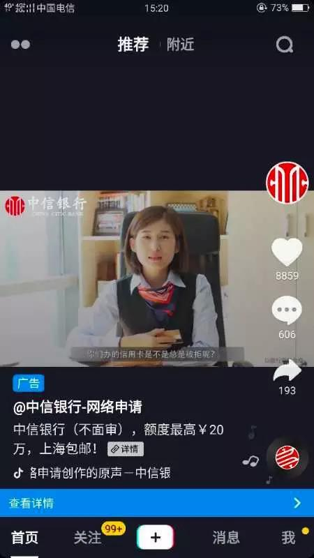 在抖音上,森林学苑发现,不仅仅互金公司,现金贷公司进行了大规模的投放。传统银行的信用卡部门也瞄准了这个新的流量帝国。
