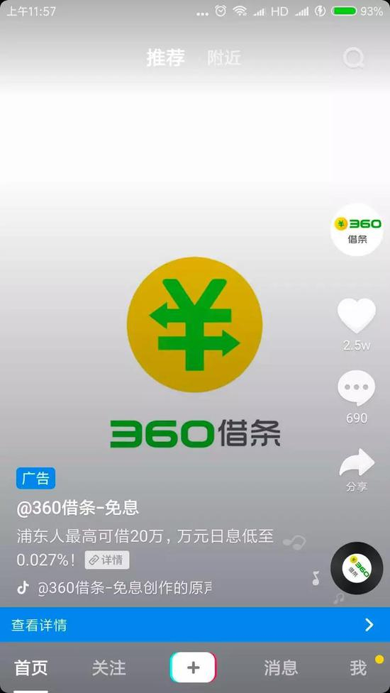 截止6月5日,这条短视频已经有2.5w个赞,690条评论。而这并不是360借条在抖音投放的唯一一个广告。