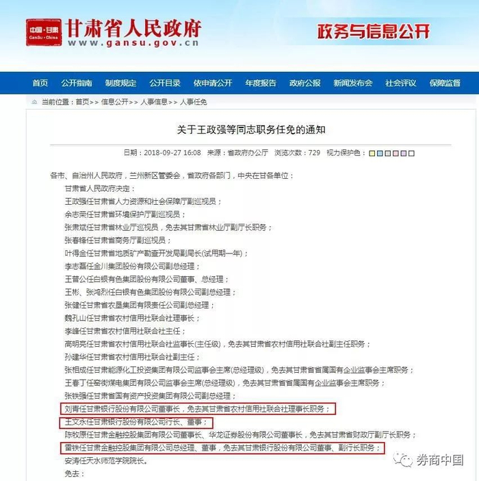 9月27日,甘肃省政府网站披露,免去甘肃银行董事长李鑫职位,刘青担任甘肃银行董事长,甘肃银行新任行长为王文永。