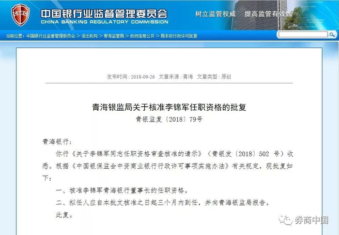 9月26日,青海省银监局披露,青海银行董事长和行长双双换帅,原青海银行行长李锦军升任董事长,核准蔡洪锐青海银行行长的任职资格,这也意味着青海银行原董事长王丽不再担任其职。