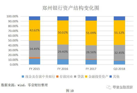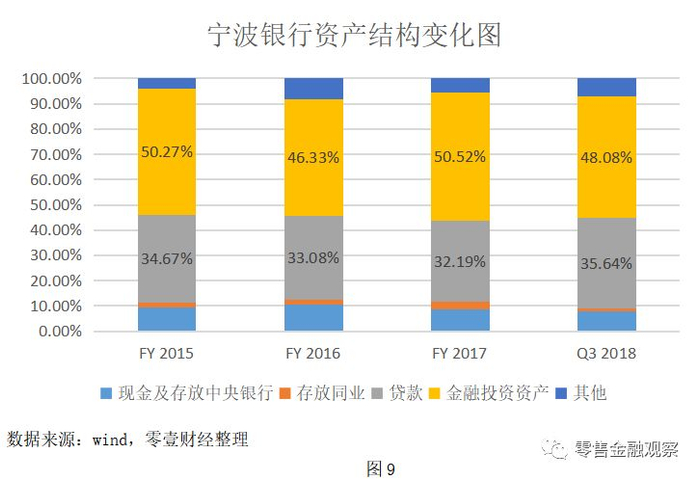 就生息资产的部分,我们可对两行2015年至今的资产构成进行分析。通过图9和图10的对比,在贷款占总资产的比重方面,宁波银行一直领先于郑州银行,且差距有渐行扩大之势。