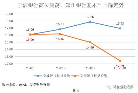如上图数据,宁波银行的权益乘数显著高于郑州银行。事实上,对比2015年至今的数据可发现,在2015年年末,郑州银行的杠杆水平(16.09)甚至高于宁波银行的杠杆水平(16.06)。但在2015年之后,郑州银行的杠杆水平基本呈下降之势,2018年前三季度相对去年末下降尤为明显;反观郑州银行,2015年至2017年杠杆水平一直在上升,进入2018年之后,虽有所下降,但比之于郑州银行降幅有限,依旧是高位震荡。