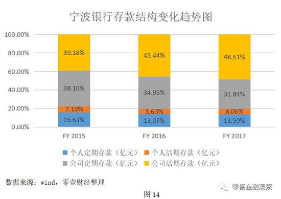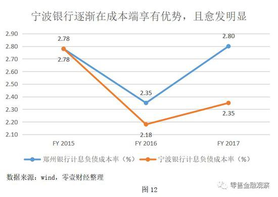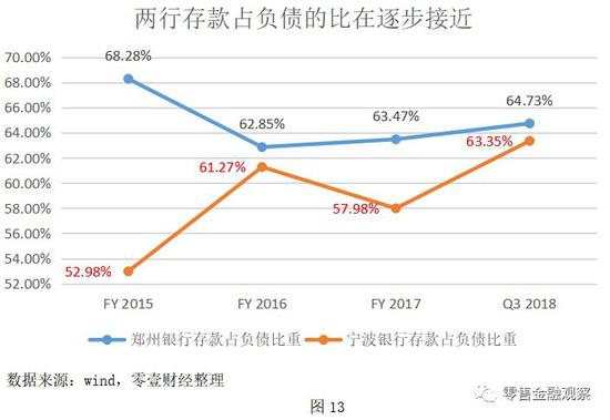 宁波银行计息负债成本的下降,主要源自其存款的迅速增长。就存款占负债的比重而言,2015年至今,宁波银行已与郑州银行无限接近。
