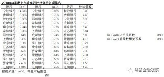 将15家城商行单独拿出来进行杜邦分析,我们发现在2018年前3季度,15家上市城商行中共有9家的权益乘数高于图1中所有28家上市银行整体的权益乘数,占比达60%。结合统计学的方法,可发现在2018年1—9月,15家上市城商行的ROE与ROA的相关系数为0.90,ROE与权益乘数的相关系数为0.93,正相关性都较强。但相对来说,权益乘数的多寡对ROE高低的贡献度更大。