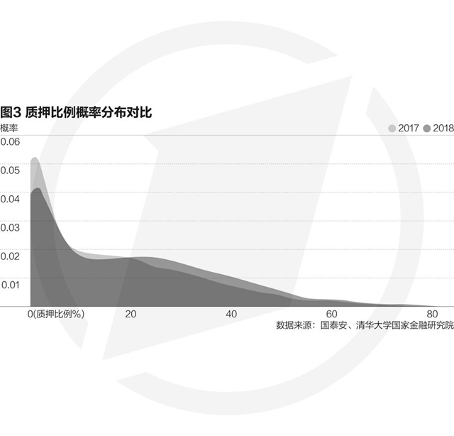 对比2018年10月底与去年同期的股权质押比例概率分布(图3),分布函数明显右移,表明高质押比例的股票数量显著增多。质押比例越高、高质押比例股票越多,股票价格之间的相关性就更强,更易在冲击到来时引发连锁反应。