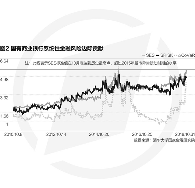 分行业比较指标的绝对值并不足以为高风险点的识别、监测和化解提供足够的参考信息,各机构因其业务侧重、经营风格、股权结构的不同,面对冲击所受影响的程度和抵御风险的能力也存在差异,我们在银行业内部再次做拆分,以国有行、股份行和城商行三个子样本做更细致的测算分析。国有行系统性金融风险边际贡献在今年多次大幅跳升,其SES值在10月底达到历史峰值(图2)。股份行系统性金融风险边际贡献上扬更为显著,其SRISK值与SES值在10月底同时达到新的历史最高点,双双突破2015年股市异常波动时期的水平。