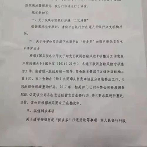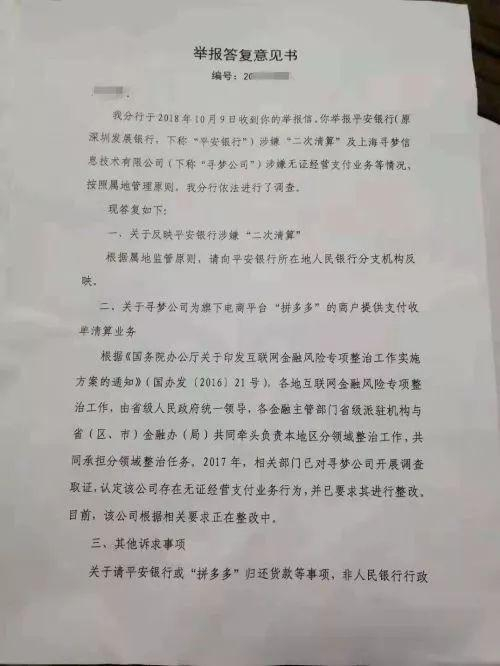 近日,有拼多多商家向媒体透露,中国人民银行上海分行已确认拼多多存在无证经营支付行为,在该商家出示的《举报意见答复意见书》中,中国人民银行上海分行称,对其举报平安银行(原深圳发展银行,下称“平安银行”)涉嫌“二次清算”及上海寻梦信技术有限公司(下称“寻梦公司”)涉嫌无证经营支付业务等情况,按照属地管理原则,依法进行了调查。