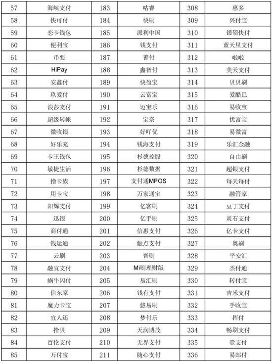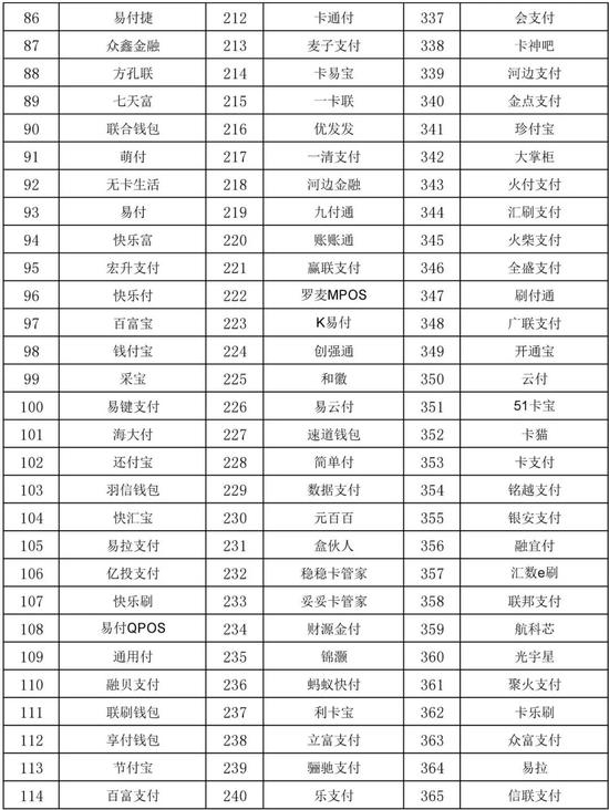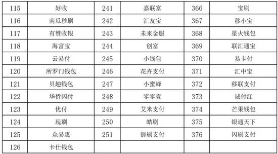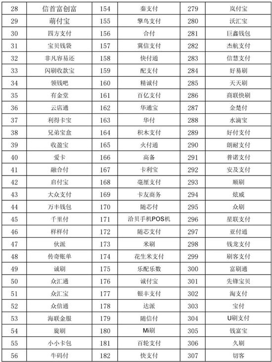萌钱包、俏美生活、无界支付、金控掌柜、可瑞生活、卡美生活、聚联支付、卡付、科锐信、银宝欣付、爱心付、卡民管家、亮刷科技、乐闪付、飞虎信用卡、美誉招财猫、51宝、中亿卡管家、多米闪付、小七助手