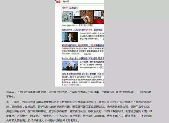 在一名为刘丰年大师个人简介中,“刘丰年老师运用周易象意风水……,并为众多企业和社会团体及个人办过风水讲座,反向热烈,影响比较大的有恒大资产……夸克金融等等”。