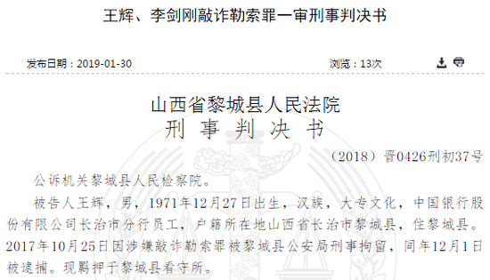 新浪财经讯 2月14日消息,前中国银行股份有限公司长治市分行员工王辉因犯敲诈勒索罪,被判处有期徒刑五年零三个月,并处罚金10000元。