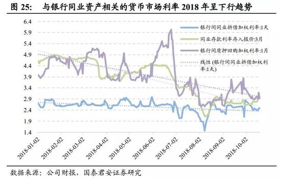 同时,除季节性原因之外造成的货币市场利率的变化也同样影响同业资产的配置数量,利率上行配置上升;利率下行配置下降。但传统同业资产占总资产较少——平均5%左右,短中期“量”方面的预测意义不大,应更关注同业拆借利率对“价”和净息差的影响。具体影响路径,在我们2018年9月16日的同系列报告《净息差分析框架:概念、方法与实战——基本面研究系列之三》中有更为详细的论述,简单来说,路径是:同业资产利率——生息资产收益率——净息差。