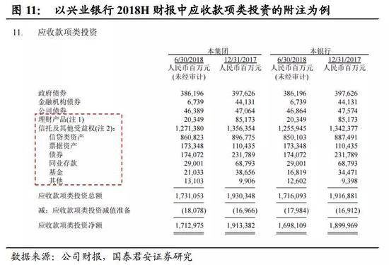 以兴业银行2018H财报中应收款项类投资的附注为例,除了该科目下的政府债券、金融机构债券和企业债券外,理财产品和信托及其他收益权类科目全部相加,就可以算作通过第三方通道持有的全部SPV,即表内非标。